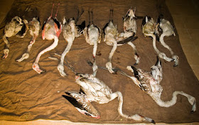 Eleven flamingos who did not survive being shot by poachers who had forced their way into the Abdaliya Nature Preserve.